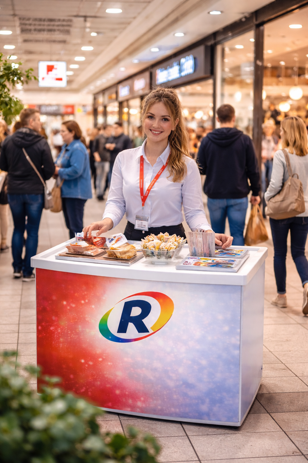 Un stand de sampling amplasat în galeria comercială permite vizibilitate mare și interacțiune directă cu un număr semnificativ de clienți într-o singură zi.